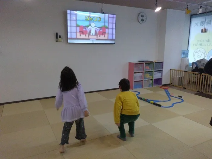モニターを見ながら、主に動的な活動を行います。今回は物語の主人公であるニアちゃんと一緒に、「忍者」からの攻撃をよける内容です。手裏剣がモニターの上に来たら「座る」、下に来たら「ジャンプ」、バナナが飛んで来たら床に「ズコーっ」とモニターと同じポーズをしてもらいます。段々と手裏剣が飛んでくるスピードがはやくなり、お子さん達も「はやい~!」と言いながらも頑張ってよけることができました。😊