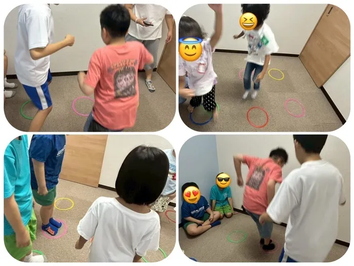 「せーの」の合図で空いてるフープに1マスジャンプをして逃げてる友達を捕まえる遊びです!