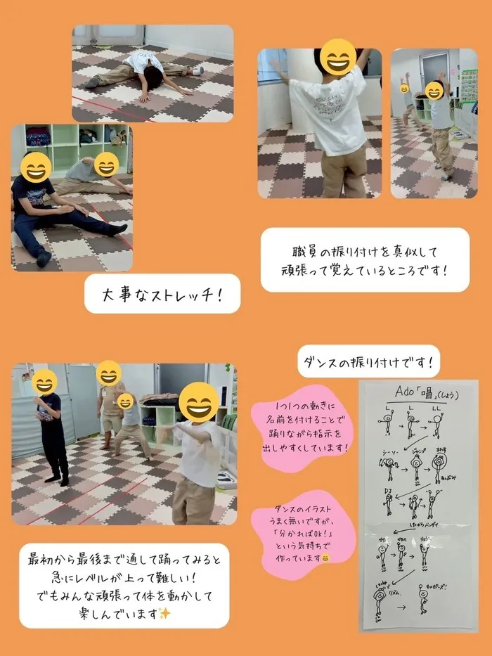 リズムが速く、振り付けも少し難しい部分がありましたが、職員のお手本や振り付けのイラストを見ながら、みんな一生懸命に体を動かして頑張る姿が見られました🎵