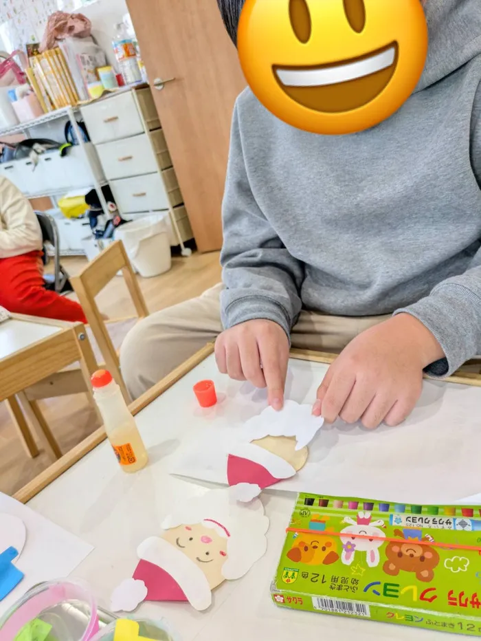 サンタさんの似顔絵を描いたり、ノリで貼り付けをしたりして、サンタさんの顔もそれぞれ特徴的で素敵なクリスマス製作が完成しました✨