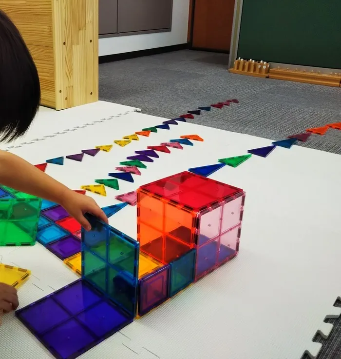 自分でマグネットタイルの上に電車を走らせて