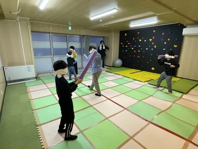 目隠しをすることで、耳・体の感覚を総動員して相手の場所を感じ取る練習になるゾ。
