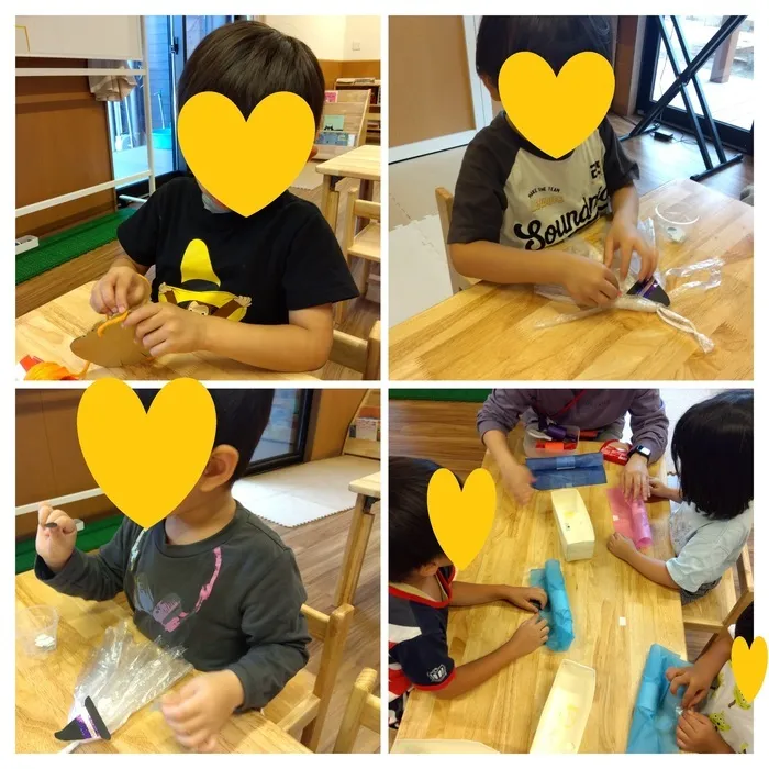 台紙に毛糸を巻き付けてカボチャを作ったり、スズランテープを裂いてオバケを作ったりとハロウィン制作を楽しみました✨