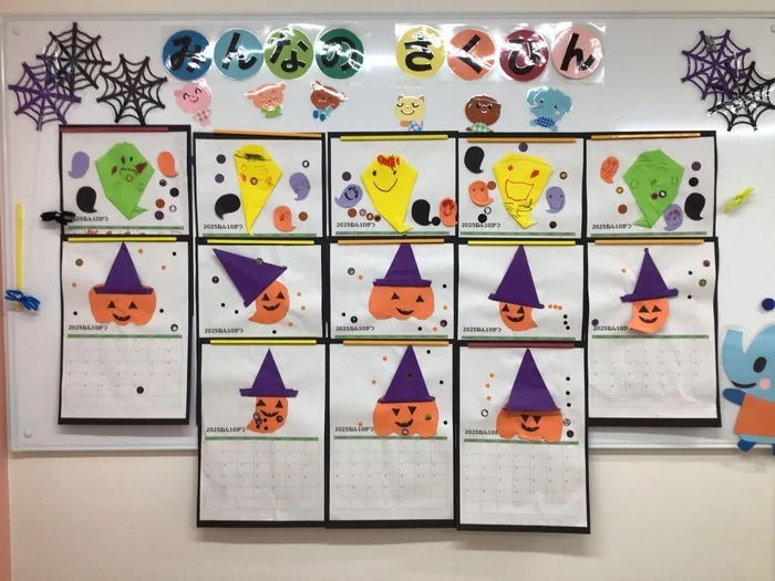 折り紙で折ったお化けやはさみで切ったジャックオーランタンを使って、カレンダーを作りました。