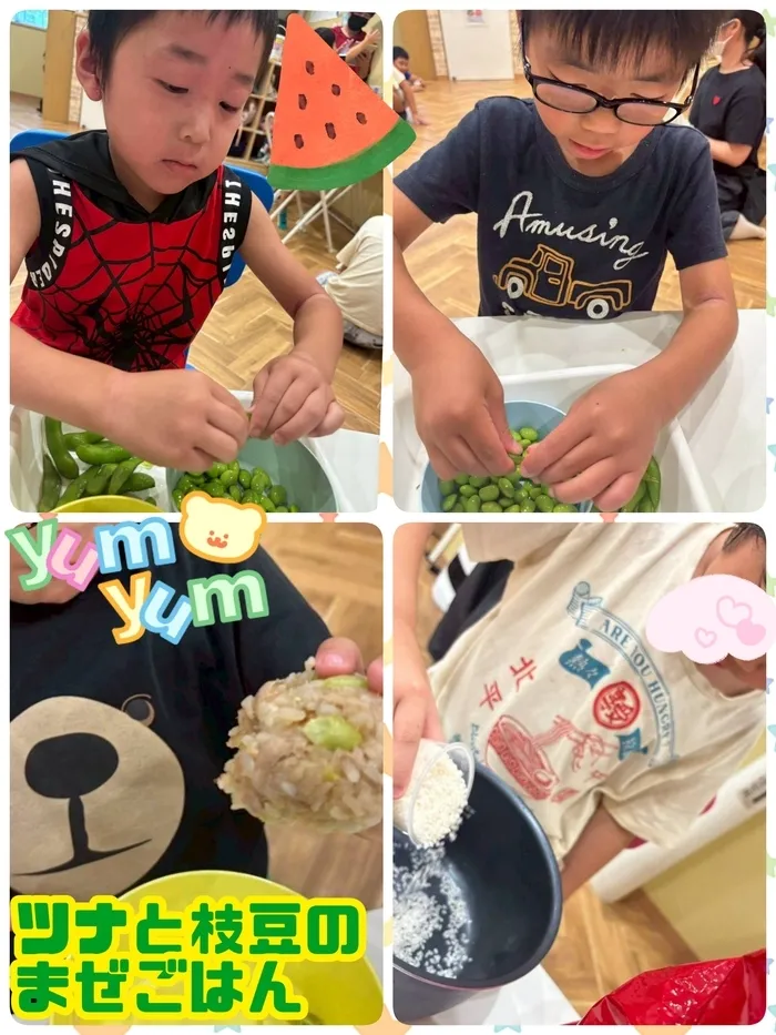 子どもたちには、枝豆を皮から出してもらったり、お米を量って研いでもらったり、調味料を入れてもらうなどなど、いろいろなお手伝いをしてもらいました✨