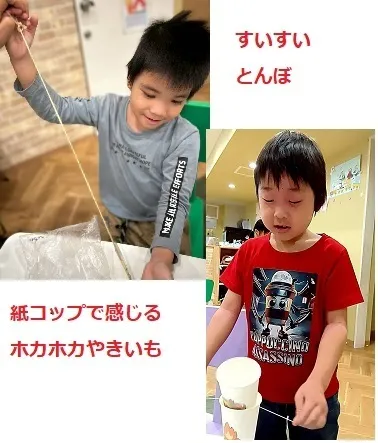 保育園児たちには、スイスイとんぼをつくり、小学生の児童たちには、紙コップでホカホカ飛び出る焼きいもをつくりました💕