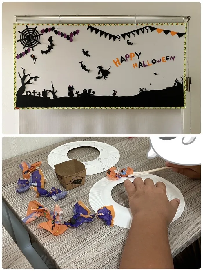 また、子どもたちはイベントに向けて、ハロウィン工作にも取り組んでおり、飾りや小物づくりを着々と進めています。