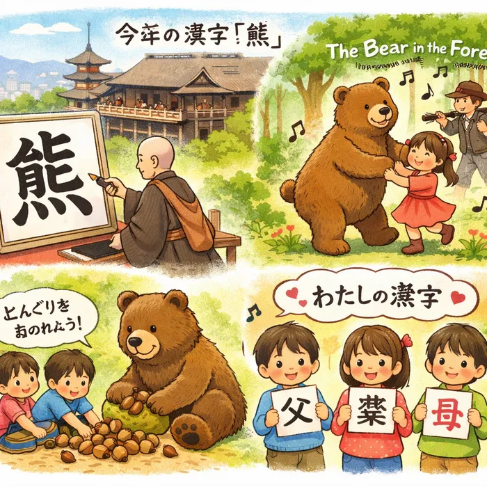 「熊」と聞くと少し怖いイメージがありますが、童謡の**『森のくまさん』**を思い浮かべる方も多いのではないでしょうか。日本語の歌詞では「やさしい熊さん、一緒におどりましょう」という、ほっとする内容ですよね。