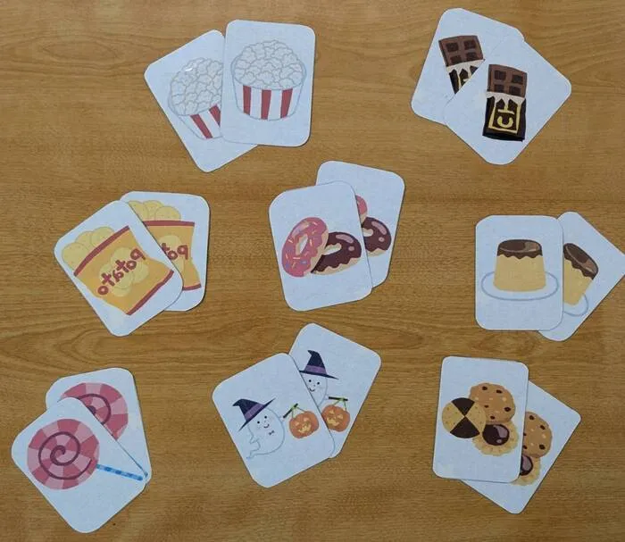 カードに描かれたお菓子の名前をスタッフと確認し、神経衰弱の要領でゲームをします。