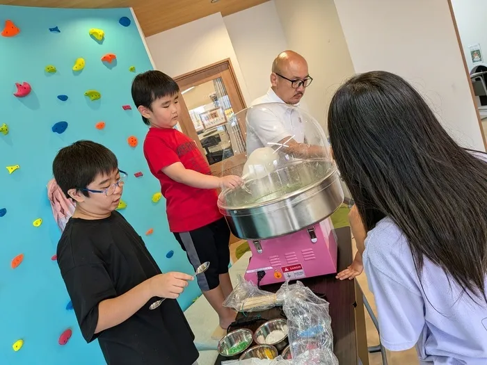 ざらめを入れる作業、わたあめを巻く作業も全て子どもたちに行ってもらいました!割り箸を回しながら、わたを巻いていく作業は繰り返していくと、どんどん上達していっていました!