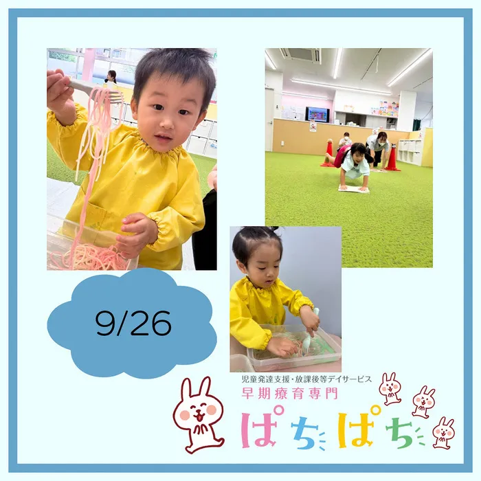 これからも、感触遊びを通して手指の分離や、力加減や力の方向性に気付く機会を作り、食具の操作や運筆、はさみの操作の向上に繋げていけるように支援して行きたいと思います☺️✨