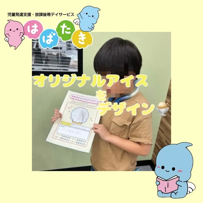 好きな色を使って自分が食べたいアイスをデザインし、アイスに名前を付けたり、どんな味か考えてひらがなで記入✏️