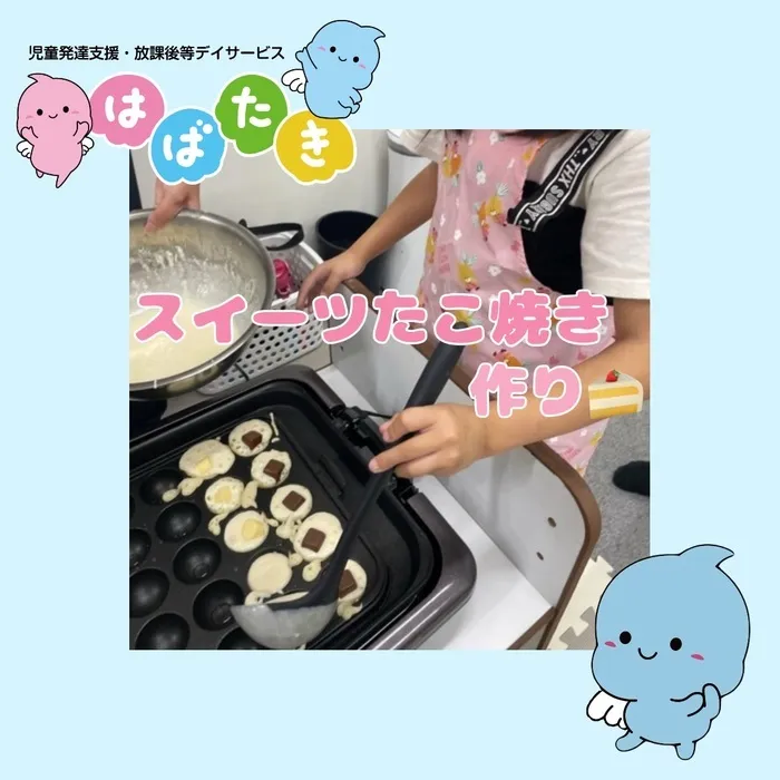 ホットケーキミックスをたこ焼き器で丸く焼き、その中にバナナを入れたり、チョコレートソースをかけて甘いたこ焼きを作りました🎶
