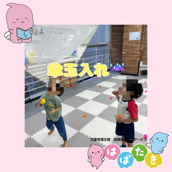 たくさんのカラーボールを拾って、逆さまにして吊るした傘に投げ入れるゲームです🎶