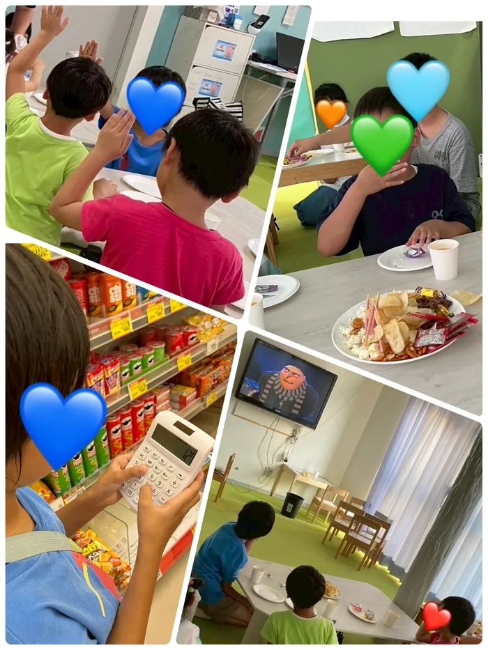 今日は公園に遊びに行く予定でしたが、気温が高かったため、室内でお菓子パーティと映画鑑賞を行いました🍭