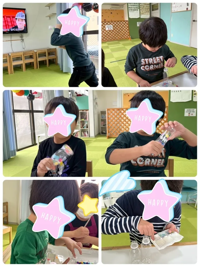 その後は、色水や洗濯糊を入れて、センサリーボトルを作って、お土産に持ち帰り、大喜びの子どもたちです🤩