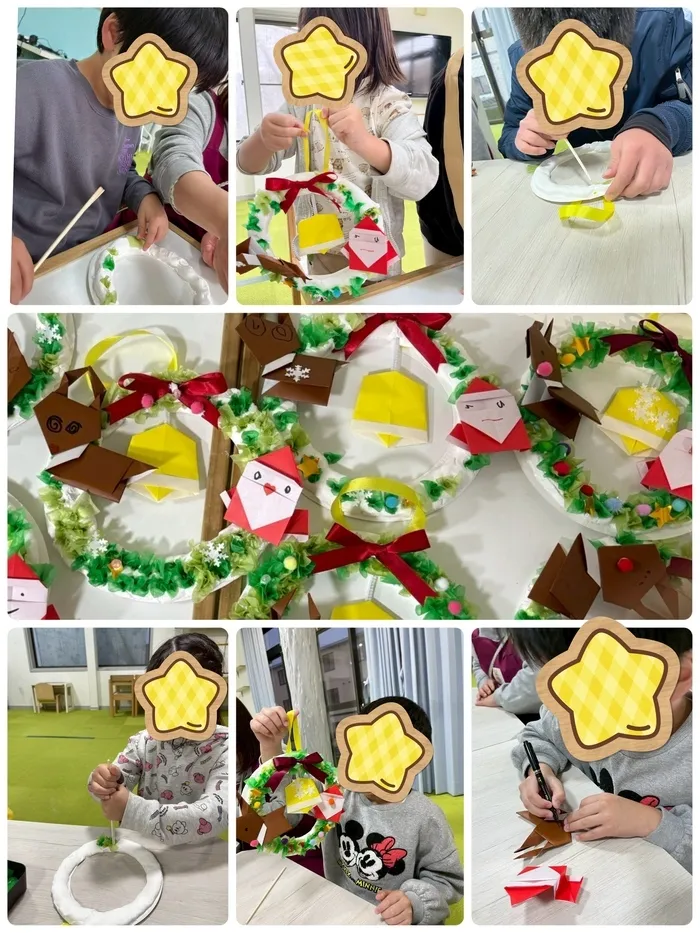 サンタやトナカイに目や鼻を書いて、リースにはカラフルに装飾して個性豊かな作品になっており、とても可愛らしい作品が出来上がりました❄️🎄