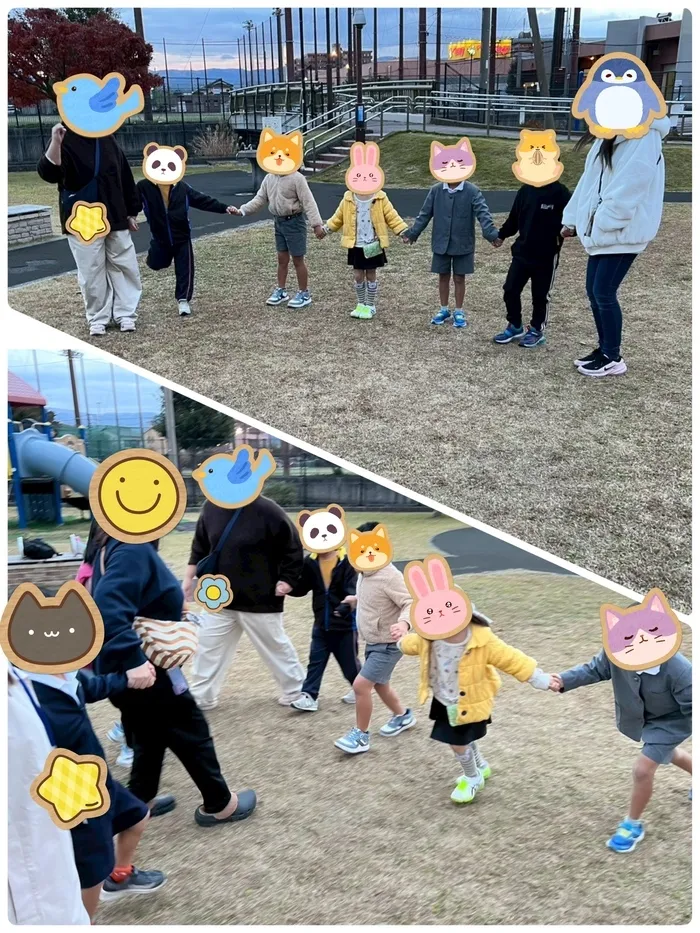 手繋ぎ鬼ごっこでは、ペアになったお友達と動きを合わせて走り回り、寒い中でも元気に楽しんでいました💪