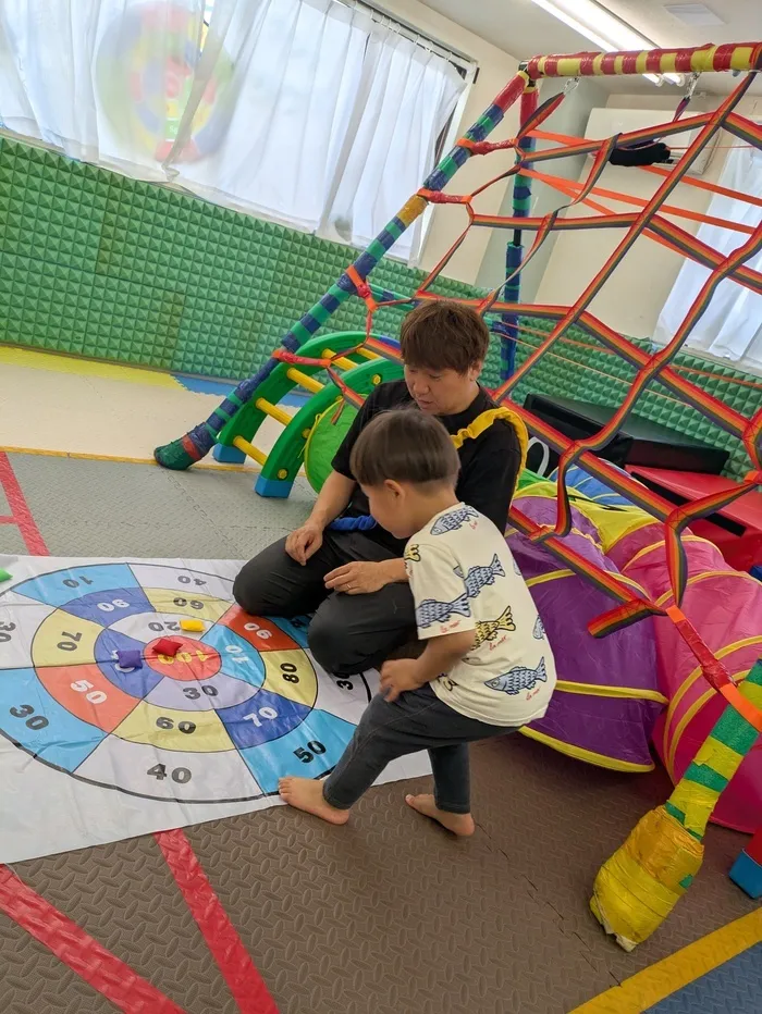 的当てを使用した運動プログラムでは、空間認知能力や、集中力や力加減の習得、体幹の強化などの効果が期待されます。子供たちは集中して楽しんでいました☆