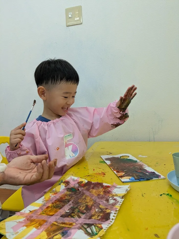パレットに出した絵の具を筆で混ぜてみたり、スモッグや手に絵の具が付く感触も確かめていました!