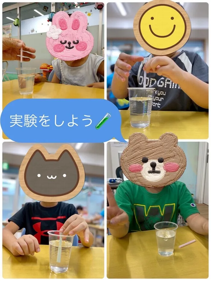 プラスチックコップに水みずを8分目ぶんめほど入いれ、それに、台所用だいどころよう 食器用洗剤を5滴ほど加えます。ストローでよくかき混ぜた後ストローの先さきを1cmほど液に差込さしこみ、口くちのところを指ゆびで押おさえて、ストローを引ひき上あげると、液中で小さなシャボン玉ができます🫧