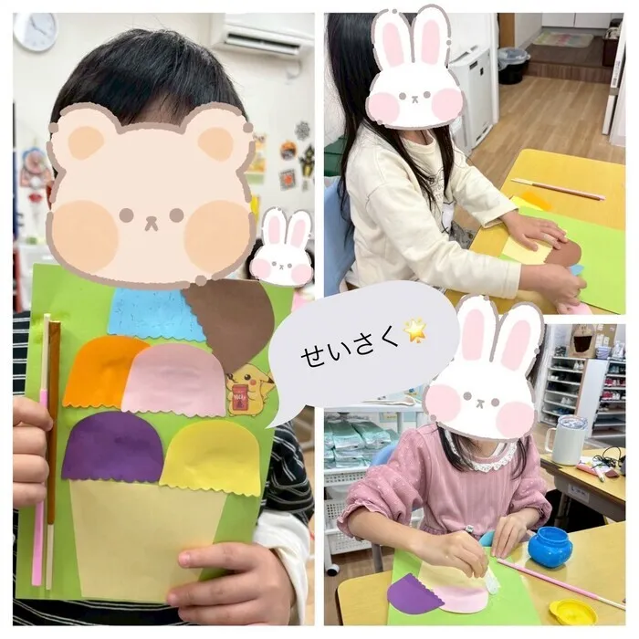11月11日ポッキーの日という事で、割り箸で作ったポッキーを子ども達に貼って貰いました😊色画用紙で作ったアイス🍦も上手に貼ることができました👏