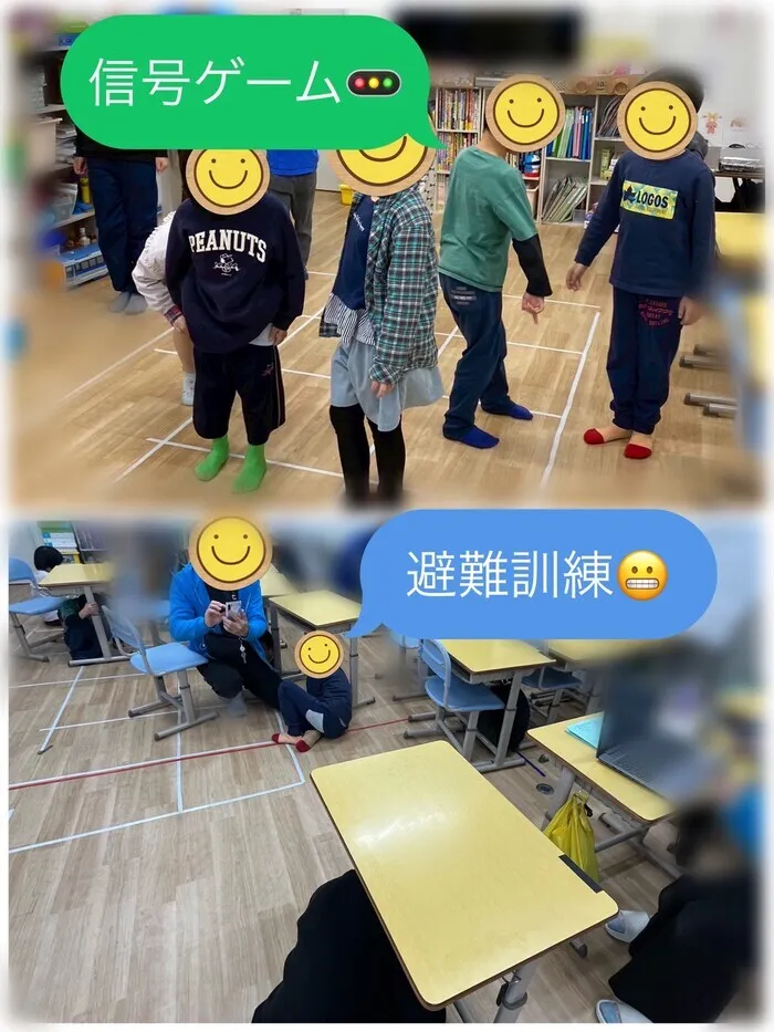 急に地震速報が鳴り、「え?地震?本当?」と一瞬驚く子どもたちでしたが、「隠れなくちゃ!!」と一人の声を筆頭にどの子もとっさに机の下に隠れ、身を守る事が出来ました👏