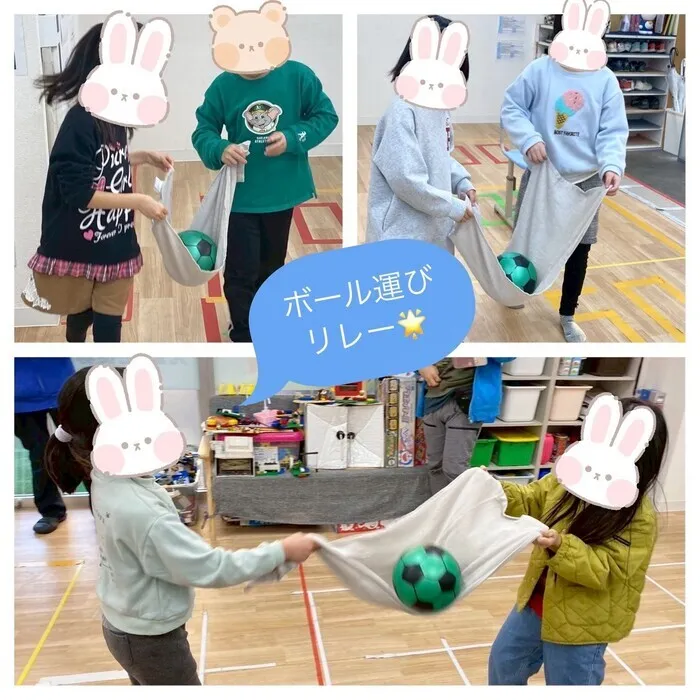 2人ペアになってタオルを使ってボールを落とさないように運んで貰いました😊ボールが落ちないように、工夫してる姿もみられました🤗✨2人で協力してボールを運ぶ事が出来ました👏