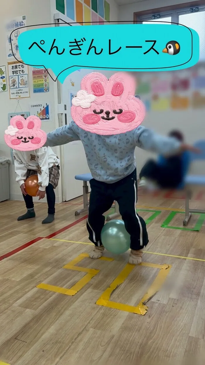風船を足に挟みペンギンになりきってよちよち歩いて頂きました😆