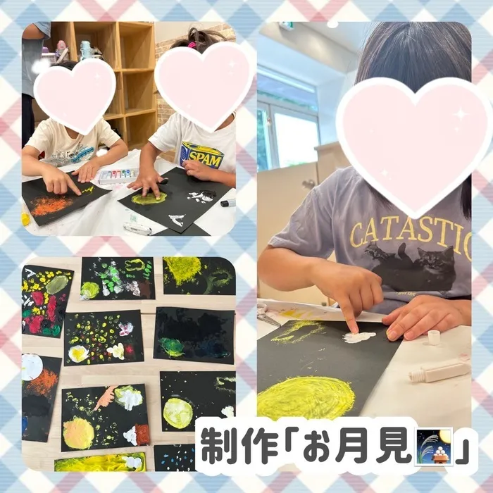 お月様や、うさぎ、お団子、すすきなど、お月見で思い浮かぶものをお友達同士で教え合いながら進めていきます😊
