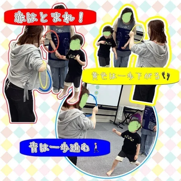 この遊びでは聞いた指示に従って動く、指示を覚えて継続することを目標に支援をしています。