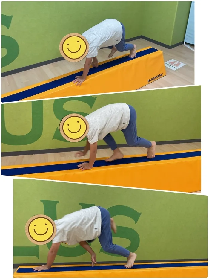 クマ歩きで四肢を支える力を養い、平均台でバランス感覚や