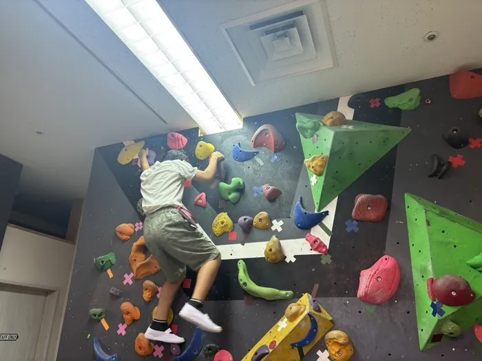 壁についているカラフルな色の突起をつかんで、登って、普段なかなかできない体験に夢中になって取り組んでいました。