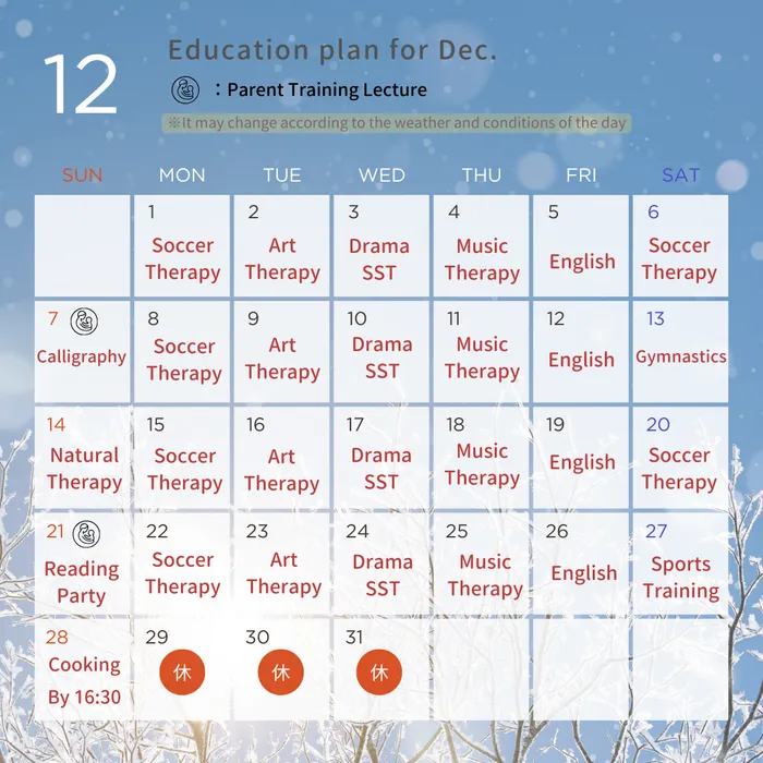 児童クラブこころらぼの12月の療育プログラム予定を公開します。
