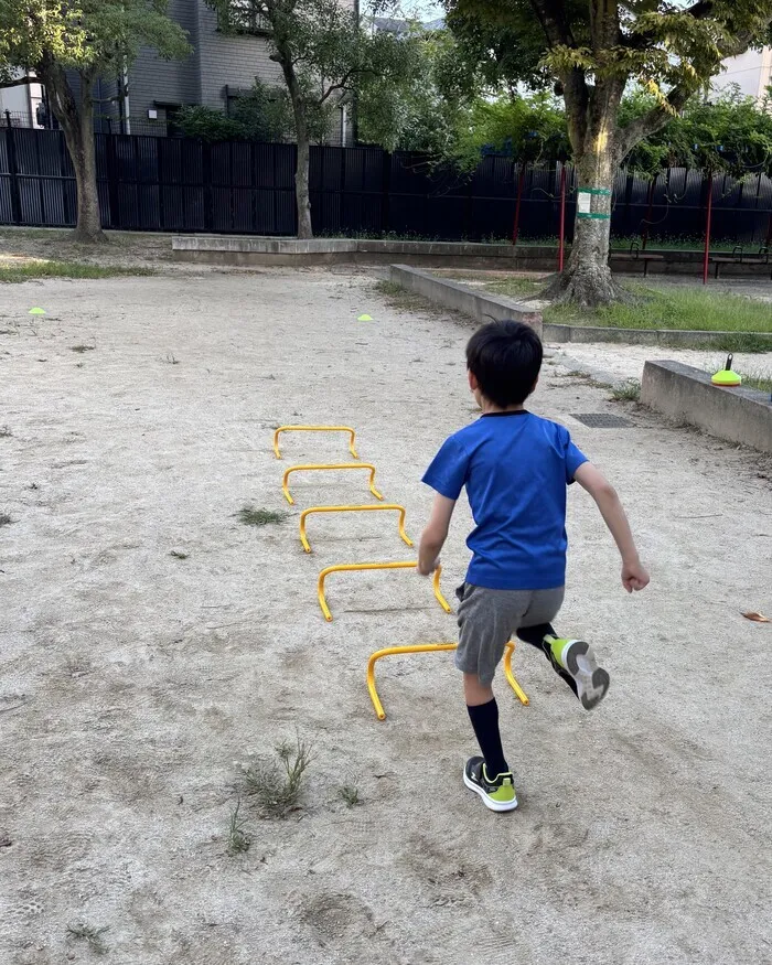 写真はミニハードルを使って走る練習をしている様子です。