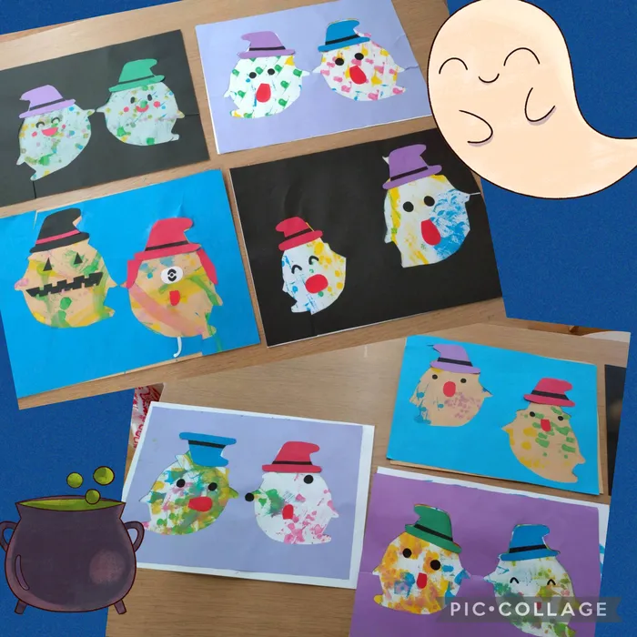 その上におばけ型に切り抜いた紙を貼りました。お顔や帽子を被せて、かわいいおばけたちがいっぱい出来ましたよ😆