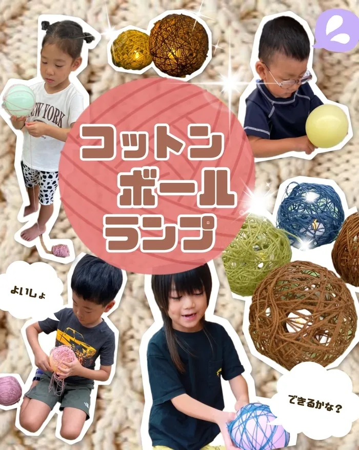 風船に毛糸を巻き付けてボンドを塗り、最後に風船を割ってライトを中に入れると完成します!✨️
