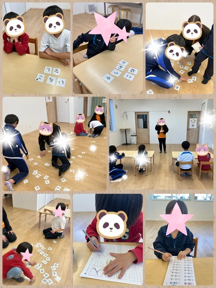 集団活動にて言葉探しゲームを行ないました!果物、乗り物、動物などスタッフがお題を出し、ペアの子となんの言葉を作るか話し合いました!繰り返し行なううちに「わにでもいい?」「何がいい?」と話し合いも上手になっていきました⭐︎言葉を決めた後は文字カードを探し、言葉を繋げて完成することができました(^O^☆♪