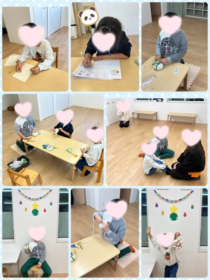 集団活動にて工作「リース」作りをおこないました!ドーナツ型の紙皿にもこもこ毛糸をそれぞれ器用に巻きつけていました👍リボンも指先を使って、真剣な表情で輪っか作りをしていました🎀出来上がるとひとりひとり完成した作品を持って嬉しそうに笑顔で記念撮影をしました😊