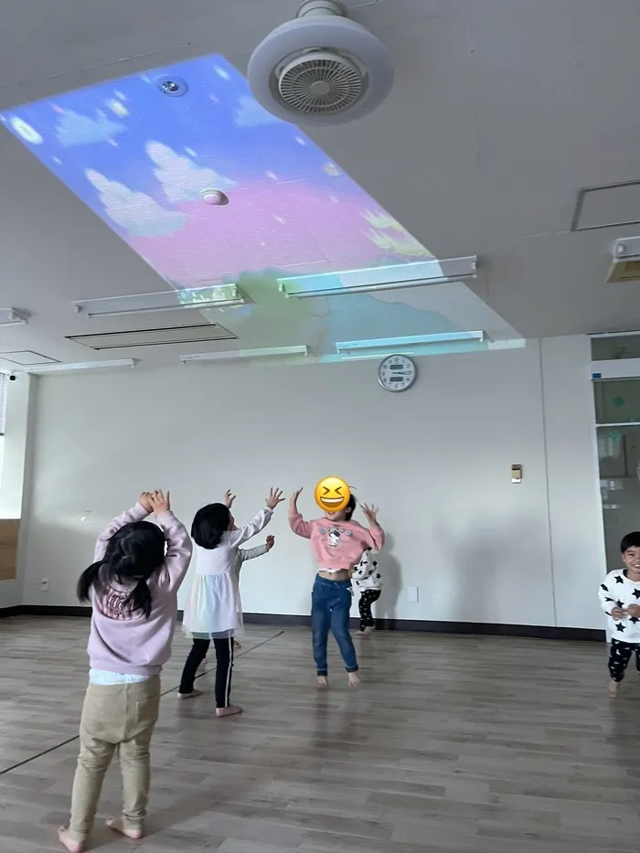 広いフロアでアートポン発表会のあとはプロジェクターを壁や天井に動かして「みんないいよー」と掛け声をかけると、自分の作品を触ろうとキャッキャと全身で飛び上がったり、追いかけたり.......