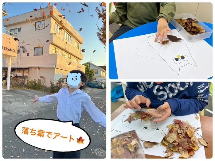 落ち葉のパリパリと言う感触を楽しみながら、ライオンやフクロウ、ハリネズミなどの動物のイラストに貼り付けて可愛らしいアートになりました🎵
