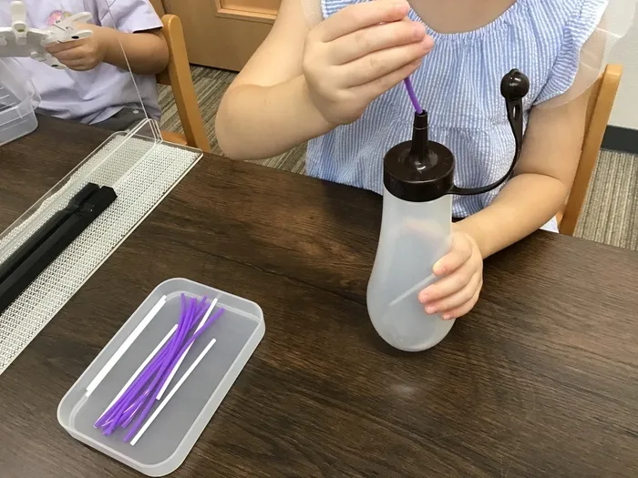 目でしっかりと穴を見ながら、ステッィクを指先で入れる動作を通して、目と手の協応動作が育つことが期待されます。