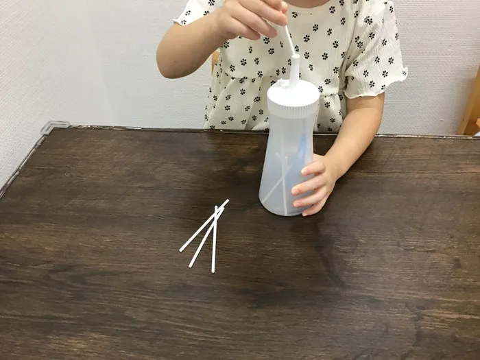 プットインは、穴に入れる物を持ち、穴を目で確認しながら取り組むことで、目と手の協応が養われます。今回のスティックは細く長いため、指先でつまみ、穴に入れる中で指先をコントロールする力も育まれていきますね!