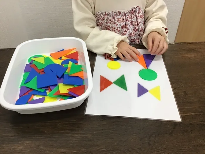 また、見本の絵と同じ図形のパーツを試行錯誤して探すことで、注意力やねばり強さも育っていきます。