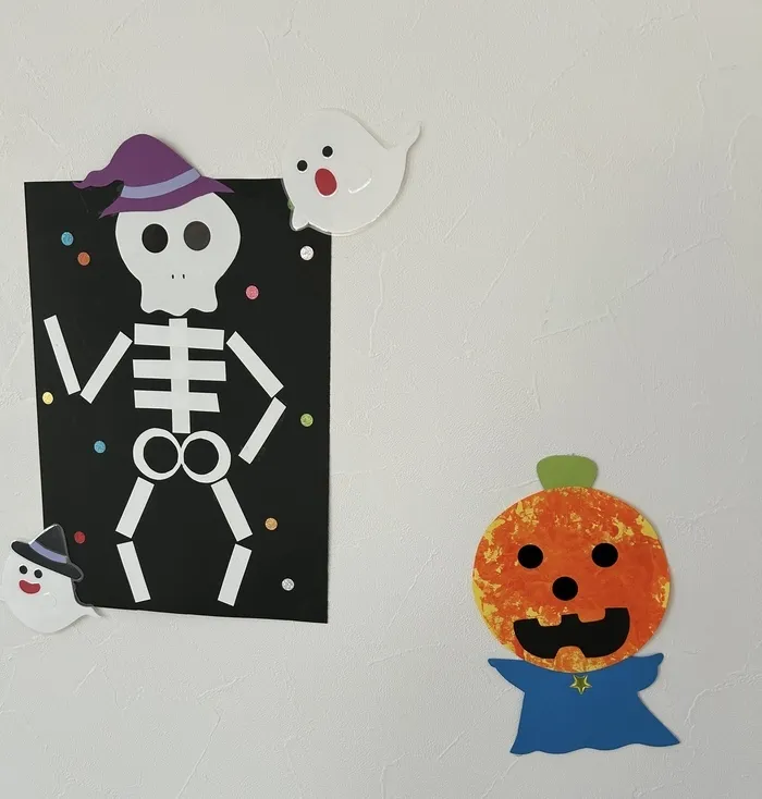 がいこつ:長い白画用紙をハサミで切って見本を参考に『骨』を貼っていきます。