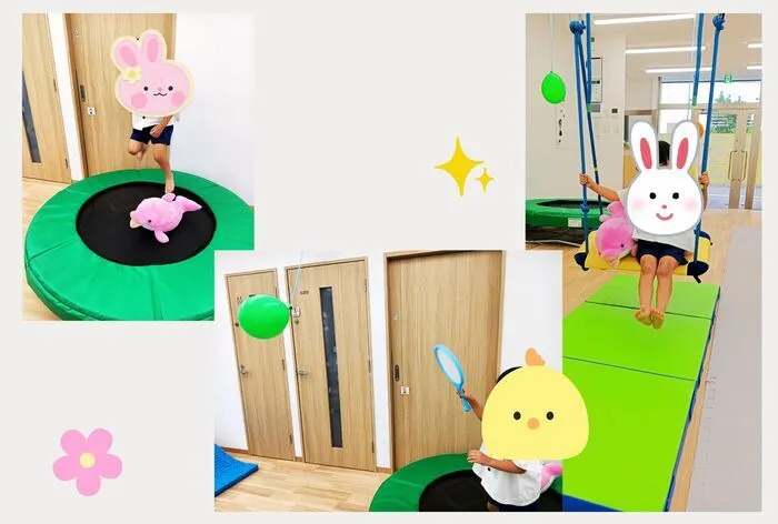 ~しながらトランポリンを跳ぶ・~も一緒に乗せるなど1つの遊具で遊びの幅を広
