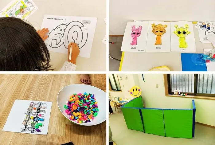 右上:スプランキーのキャラクターにタンポ・絵の具を使ってたのしんだよ。
