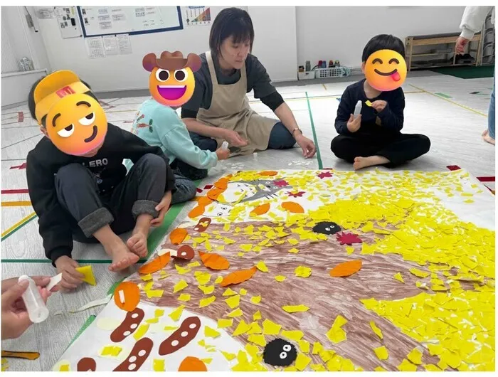 切って、ちぎって、ペッタンペッタ貼って😚 みんなで協力してきれいなイチョウの木が完成しました👌