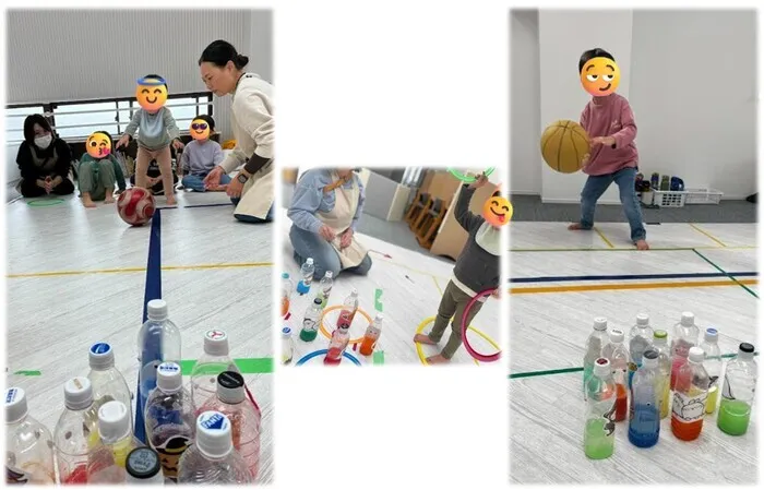 小さい子も楽しめるボーリング🎳 空間認知や集中力、お友だちの応援などたくさんの学びがありますね。輪投げも出来たりね♪