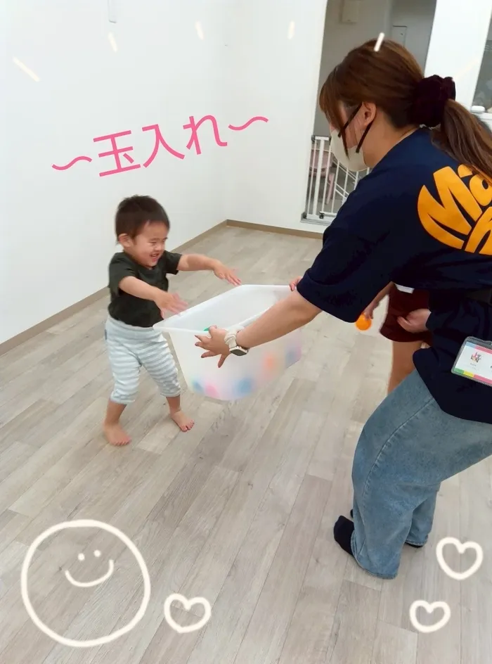 🩷運動能力の発達:玉を投げたり、拾ったりする全身運動を通して、身体を動かす楽しさを味わいます✨️また、力加減や距離などを考え、試行錯誤することで目と手の協調運動や空間認識能力が養われます☺️